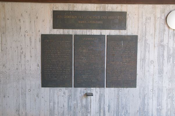 Eine Inschriften- sowie drei Namenstafeln in der offenen Aussegnungshalle