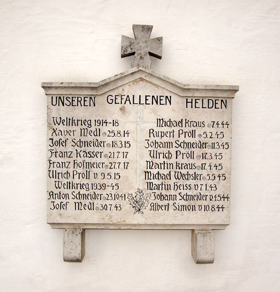 Gefreiter | PRÖLL | Ulrich | 10.04.1878 Berletzhausen | 09.05.1915 Neuville | Res. Inf. Rgt. 10, 8. Kp. | vermißt, gerichtl. † erkl., Kriegsgräberstätte St. Laurent‑Blangy (F) |