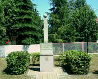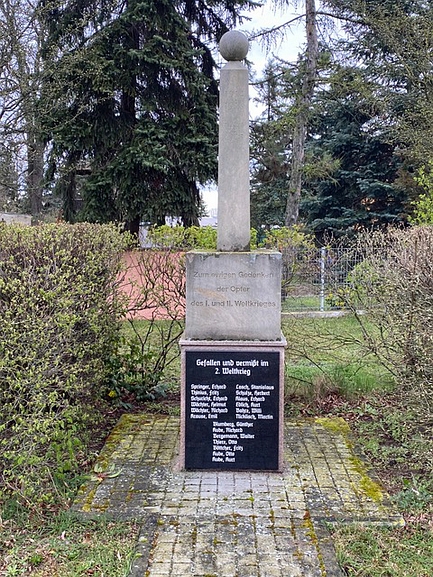Stele mit krönender Kugel, die auf zwei Sockeln steht. Nach 2005 wurde das Denkmal restauriert und im unteren Teil eine Tafel mit den Namen der Gefallenen und Vermissten des 2. Weltkriegs angebracht.