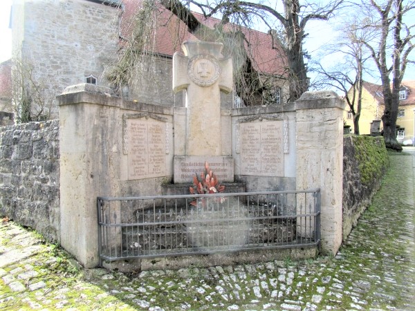 Vor der Kirche St. Maria und St. Margarete, an der Ecke Kirchstraße/Schulgasse, wurde das Denkmal errichtet. Sie besteht aus zwei Eckobelisken, die durch eine Art Mauer mit Namenstafeln verbunden sind. In der Mitte ein alles überragendes Kreuz mit einem Eisernen Kreuz im Siegeskranz. Am Fuße des Kreuzes eine Gedenktafel mit Widmung. Zwischen den Obelisken und dem Kreuz links und rechts befinden sich zwei Tafeln. Diese sind bekränzt und enthalten die Namen der Kriegsopfer. Die Anlage wird an der Frontseite durch ein Ziergitter geschützt. Zwei Stufen führen dahinter zur Anlage. Das Denkmal besteht aus Kalksandstein und wurde kürzlich renoviert. Die Inschriften sind farblich hervorgehoben.