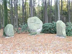 Aus drei beschrifteten Findlingen bestehende Denkmalanlage in Grünenkamp, im Wald an der Ecke Westersteder Straße / Klattenhofstraße