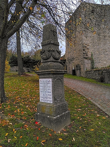 Das Denkmal wurde laut Inschrift für Verstorbene des Hamburgischen Kontingents errichtet. Die Inschriften sind im Gegensatz zu den Namenstafeln kaum noch bis nicht mehr, vor allem die zweite Inschrift, zu entziffern. Laut Namenstafeln sind fünf Soldaten in Grünsfeld bestattet, acht in verschiedenen Orten der Main-Tauber-Region. Das Denkmal steht im mittleren Bereich des Friedhofs.
