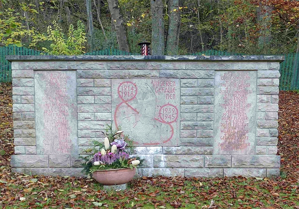 Auf dem Friedhof befindet sich das Kriegerdenkmal. Eine mit Steinen verkleidete Wand, in der Namenstafeln aus Stein eingefügt sind.