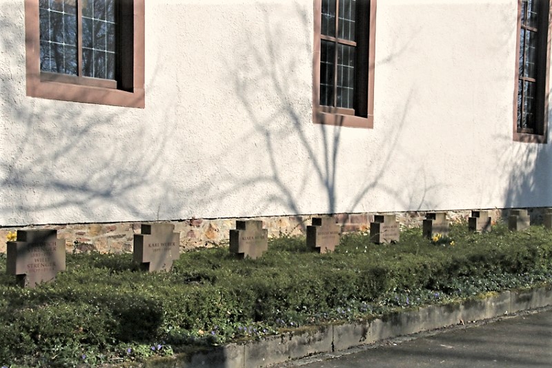 Kriegsgräber bei der Friedhofskapelle, sowie Daten von privaten Gedenksteinen.