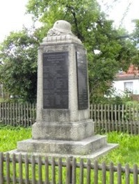 In einer kleinen umzäunten Anlage das Ehrenmal für die 39 bzw. 67 Kriegstoten beider Weltkriege. Auf einem gestuften Sockel ein stumpfer Obelisk,