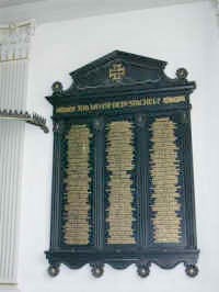 In der Kirche zwei hölzerne schwarze Gedenktafeln mit goldener Schrift, Namen der 158 Opfer des Ersten Weltkrieges aus Breiholz, Prinzenmoor, Westermühlen, Hamdorf und Elsdorf.