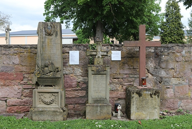 Soldatengräber an einer Mauer im Außenbereich der Aussegnungshalle.