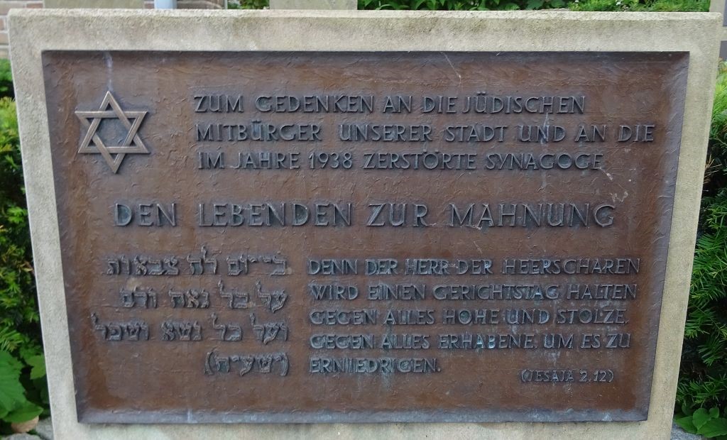 Zum Gedenken an die Jüdischen Mitbürger unserer Stadt und an die im Jahr 1938 zerstörte Synagoge.