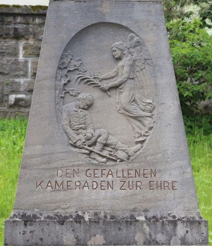 Am Sockel sind in die Vorderseite und in die rechte Seitenfläche die Namen der Gefallenen und Vermissten beider Weltkriege eingeschlagen.