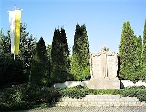 Auf einem Steinsockel steht eine Figur aus Stein, die ihre Arme ausbreitet. Im Umhang, der von den Armen nach unten reicht, sind Namen gegetragen.