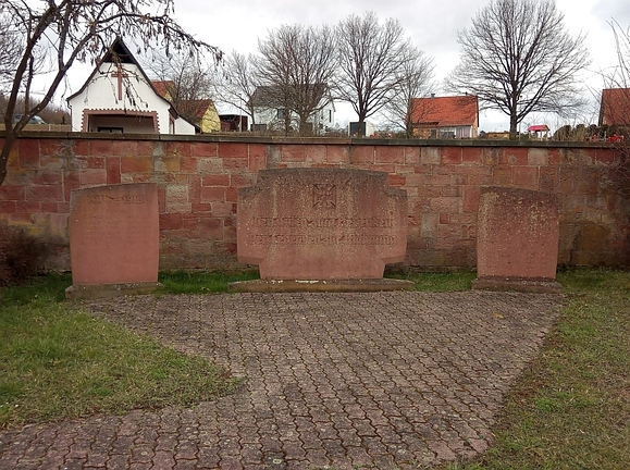Links und rechts eines kreuzförmigen Steines mit Gedenkinschrift steht jeweils eine Steintafel