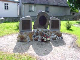 Hinter der Kirche: Auf einem mit Feldsteinen gebauten Podest stehen drei Steinplatten mit Tafeln der Gefallen der beiden Weltkriege.