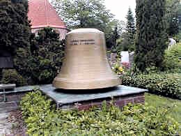 Stahlglocke auf gemauertem Sockel, alte Grabplatte an Kirchenmauer.