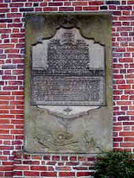 Anmerkung zur Grabplatte: Das aufrecht gestellte Denkmal befindet sich an der äußeren nördlichen Kirchenmauer in Höhe des Chors. Dabei handelt es sich um eine