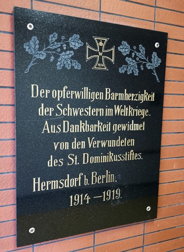 Gedenktafel im katholischen Dominikus-Krankenhaus, das im Ersten Weltkrieg als Lazarett genutzt wurde.