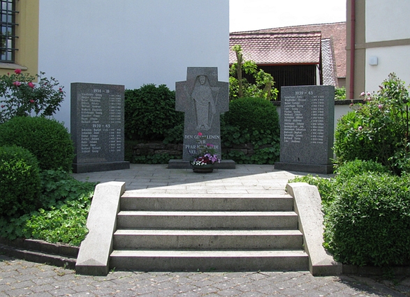 Links und rechts einer Gedenktafel in Form eines Kreuzes mit dem Relief der Auferstehung Jesu Christi und einer Gedenkinschrift steht je eine Steintafel mit den Namen und Lebensdaten der Gefallenen beider Weltkriege der Pfarrgemeinde Herrnsdorf.