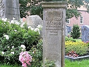 Eine schlichte eckige Gedenksäule aus Stein auf dem hinteren Teil des Friedhofs an der Kirche für einen Vermissten.