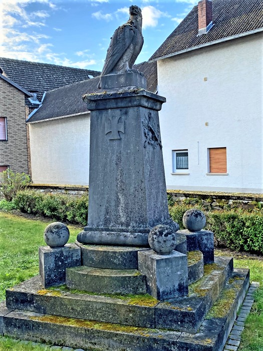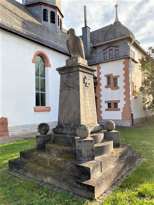 Das Kriegerdenkmal aus dem Jahr 1921 im Südwesten vor der Kirche trägt über einem zweistufigen Sockel auf einer Stele mit einem bekrönenden Adler die Namen von 24 Gefallenen des Ersten Weltkriegs.