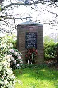 Klinkermonument mit aufgesetztem Kreuz. Eingelassene Tafel für die Kriegstoten beider Weltkriege.