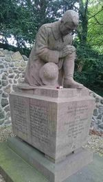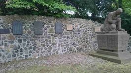 Denkmalsanlage vor dem Kirchenhügel: Säule mit krönendem Adler für die Teilnehmer des Krieges von 1870/71, halbrunde Steinwand mit Namenstafeln der Gefallenen und Bombenopfern des Zweiten Weltkriegs mit davorstehendem Stein-Sarkophag mit den Namen der Gefallenen des Ersten Weltkriegs, darauf eine große knienden Soldatenfigur.