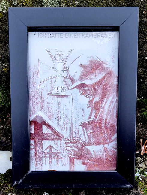 Denkmal für den 1. Weltkrieg ohne Namen, die erste Zeile der Inschrift ist nicht mehr lesbar. Am Sockel lehnt ein kleines Gedenkbild.