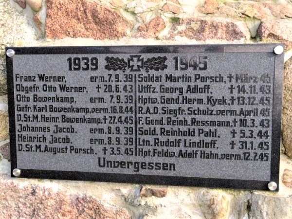Auf einem Natursteindenkmal in der Ortsmitte von Holxen sind drei Gedenkplatten aus Stein mit Inschriften für die Gefallenen der beiden Weltkriege angebracht.