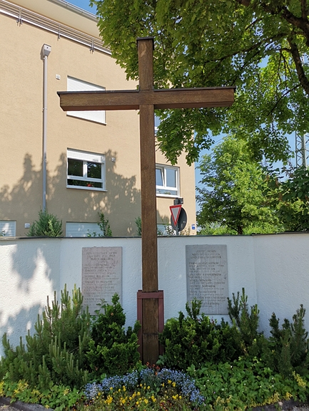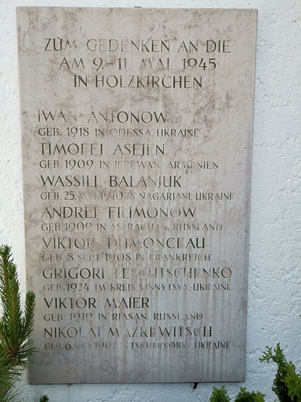 Im nördlichsten Winkel des alten Friedhofs in Holzkirchen (Oberbayern) steht ein großes Holzkreuz. Links und rechts dahinter befinden sich zwei Steintafeln mit 16 Namen von Kriegsgefangenen und Zwangsarbeitern aus verschiedenen Ländern.