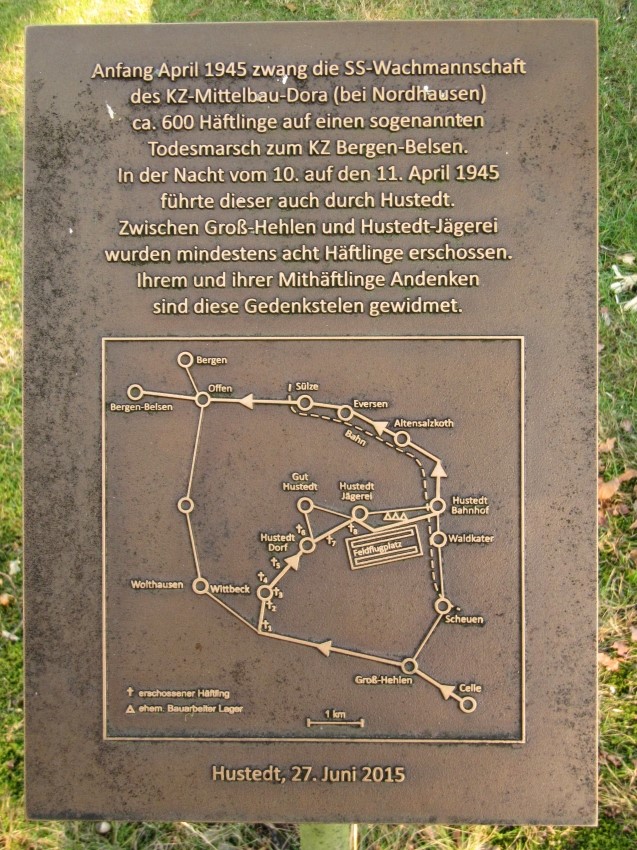Auf dem Gelände des Bildungszentrums Heimvolkshochschule Hustedt e.V. (Hustedt Jägerei, Unter den Eichen) befinden sich acht Granitstelen und eine Erinnerungstafel zum Gedenken an acht im April 1945 erschossene Häftlinge auf einem sogenannten „Todesmarsch“ zum Konzentrationslager Bergen-Belsen.