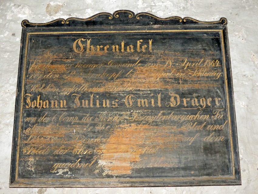 An der Wand hängt eine Holztafel für den Feldzug von 1864.
