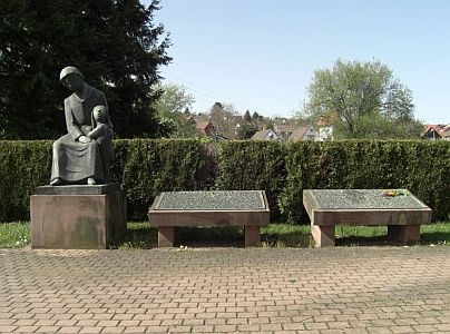 Daneben zwei Sandsteintische, auf denen Gedenkplatten angebracht sind.