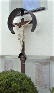 An der Rückseite der Kirchenwand ein Kreuz mit Jesus, unten eine Inschrift.