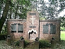 Hinter der Kirche am Friedhof unter großen Bäumen steht eine rote Backsteinwand im Halbkreis begrenzt durch Backsteinpfeiler und Eisenketten.