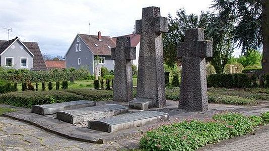 Drei große Steinkreuze, davor drei liegende Gedenkplatten auf Betonsockeln.