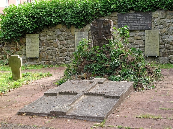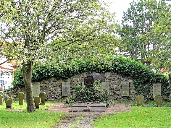 Zentral vor der Gedenkmauer ist eine liegende Gedenkplatte mit kirchlichem Kreuz (inkl. Inschrift) sowie eine Steinsäule mit einem Eisernen Kreuz (aus Metall - in den Kreuzspitzen die Jahresdaten der beiden Weltkriege) zu finden. Diese Steinsäule ist gleichzeitig ein Gedenkstein für fünf dort beerdigte Unbekannte der Seeschlacht vor Helgoland (am 28.08.1914). Ebenfalls auf der Rückseite sind zwei weitere Gedenkplatten vorhanden. Eine davon ist (zumindest ohne Hilfsmittel) leider nicht mehr lesbar, die andere ist eine gesonderte Gedenkplatte für einen 1944 Gefallenen.