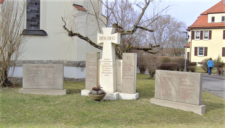 Rechts und links daneben eine Steinsäule mit den Namen des Ersten Weltkriegs und außen ein Gedenkstein mit den Namen des Zweiten Weltkriegs.