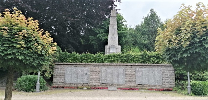darunter an der Steinwand Tafeln mit Namen der Gefallenen des Zweiten Weltkriegs.