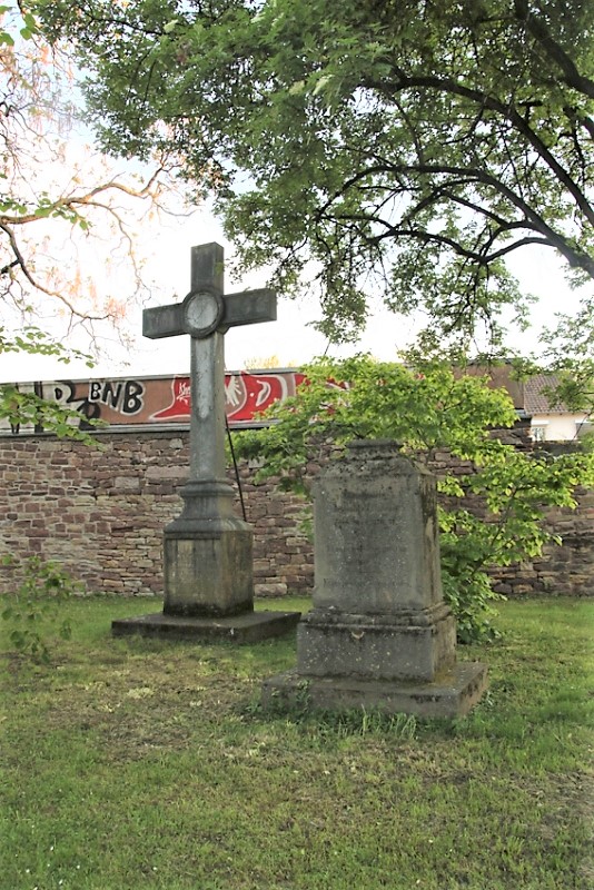 1870/71: Deutsch-Französisches Denkmal, etwas versteckt, bestehend aus Hochkreuz und einem Sockel.