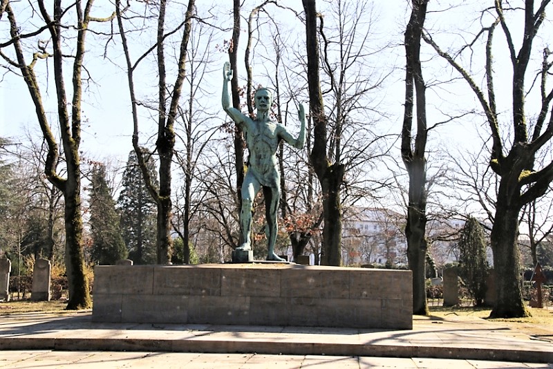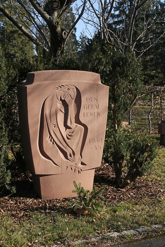 Kriegsgräber Zweiter Weltkriegin der Nähe der Abdankungshalle und fünf Namen, welche zwischen den Steinen des Ersten Weltkriegs sind; davor Gedenkstein mit Trauernden.