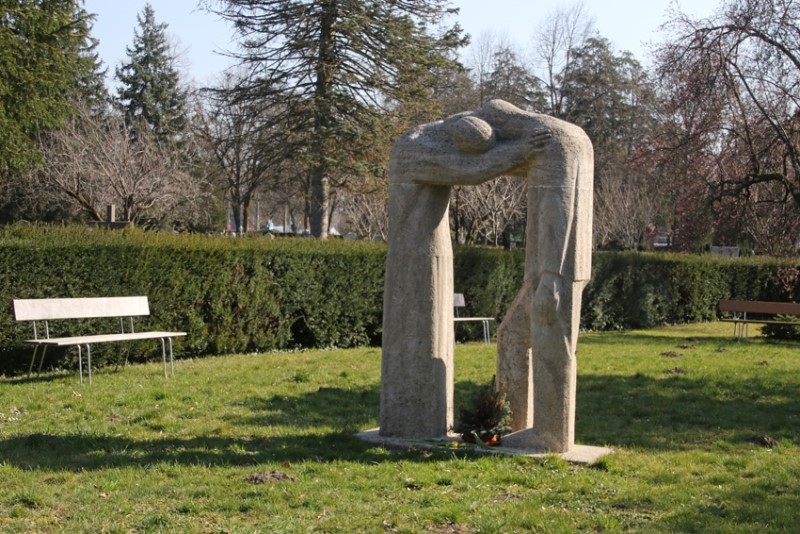Im Hauptfriedhof: Denkmal “Tor der Schmerzen”, etwas daneben eine Info-Tafel.