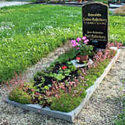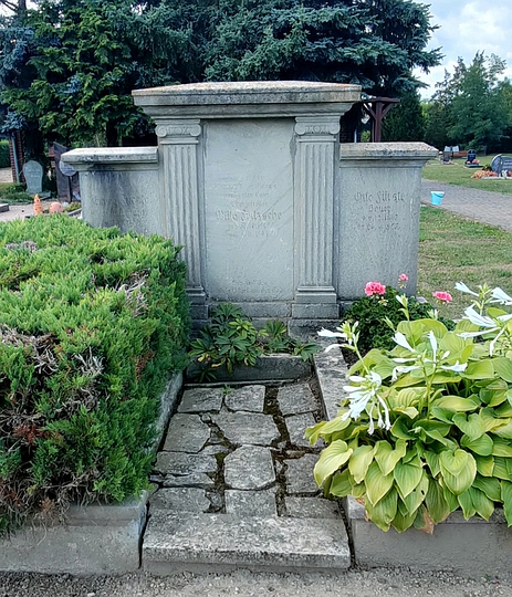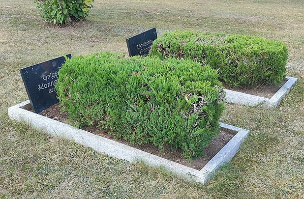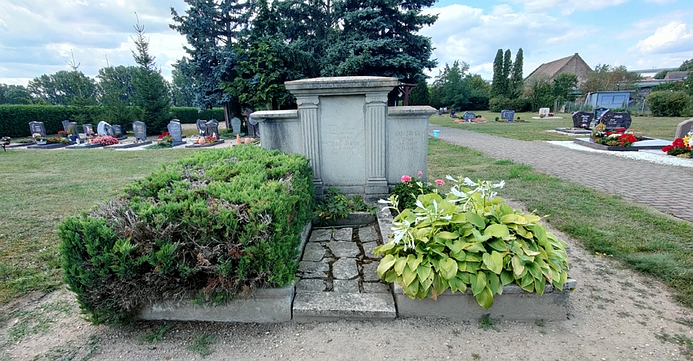 Zwei Kriegsgräber sowie Einzelgedenken auf Familiengräbern im Friedhof.