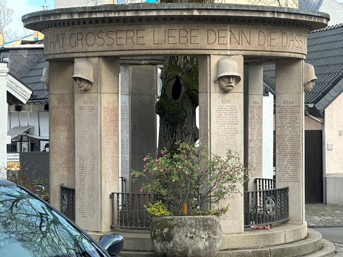 Kriegerdenkmal in Form eines Rondells. An den sechs Säulen sind Soldatenköpfe angebracht und die Namen der Gefallenen und Vermissten verzeichnet. Leider sind einige Namen kaum mehr lesbar.