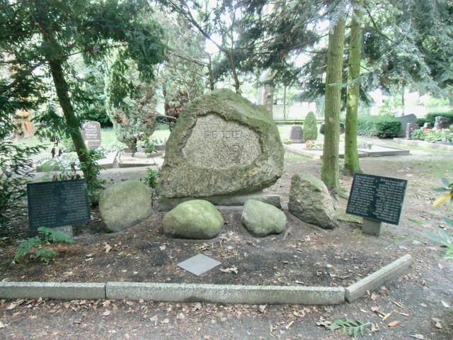 Etwas abseits, auf dem Kirchhof ein großer Findling mit davor liegenden kleineren. Begrenzt rechts und links von einer Tafel mit Namen.