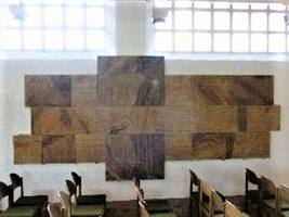 In der verschlossenen Aussegnungshalle (*) ist aus 19 Steinplatten ein Mosaik zusammengesetzt. Daneben eine weitere Gedenkplatte.
