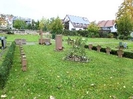 Kriegsgräberstätte auf dem Friedhof. Ein Sandsteinkreuz vor einer rechteckigen Steinplatte, davor eine Metalltafel. An zwei Seiten Steinkreuze.
