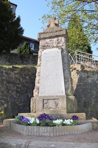 Das Gefallenendenkmal aus Muschelkalk in Form eines Obelisken mit Kreuz an der Spitze, an dessen Sockel befindet sich ein stilisierter Stahlhelm mit einem Bajonett. Die nach dem Zweiten Weltkrieg am Sockel angebrachte Gedenkplatte für die Gefallenen wurde in den siebziger Jahren beschädigt, eine neuere größere Platte verdeckt seitdem die Gefallenen und Inschriften des Ersten Weltkriegs. Für 2024 ist eine Instandhaltung mit Rekonstruktion der Inschriften geplant.
