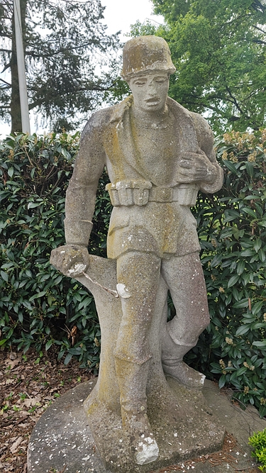 rechter Hand die lebensgroße Skulptur eines Soldaten, der erschöpft auf einem Baumstumpf sitzt.