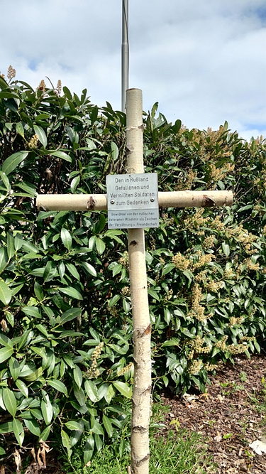 Vor dem zentralen Kreuz befindet sich eine kleine Gedenktafel.