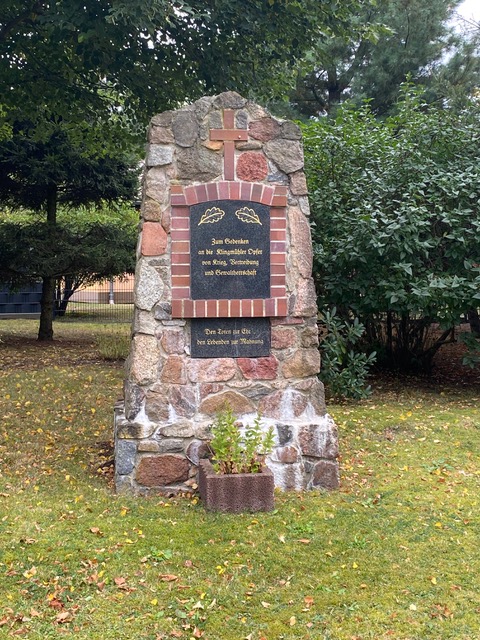 Aus Natursteinen gemauerte Stele mit eingelassenen Tafeln an der Bergheider Straße, nach 1990 errichtet.