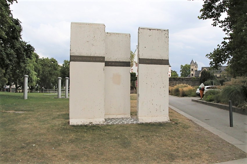 Drei Betonwände am Peter-Altmeier-Ufer, in der ein Metallband um jede Wand, etwas daneben Info-Tafel.
