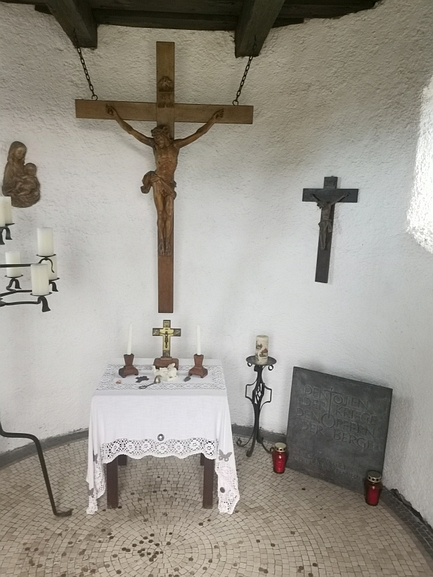 Auf dem Gipfel steht die Fahrenberg-Kapelle (Schild) mit Gedenktafeln für die Gefallenen der beiden Weltkriege.